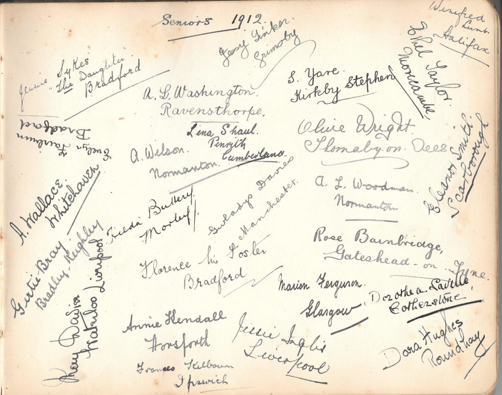 Each signature on this page is a fragment of a larger story: young lives from across England and Scotland, briefly united at a Leeds college in 1912, soon to be scattered again by geography, career, and—tragically—history itself. The album preserves their names and hometowns, offering a rare and personal record of Edwardian youth on the eve of a world about to change forever.