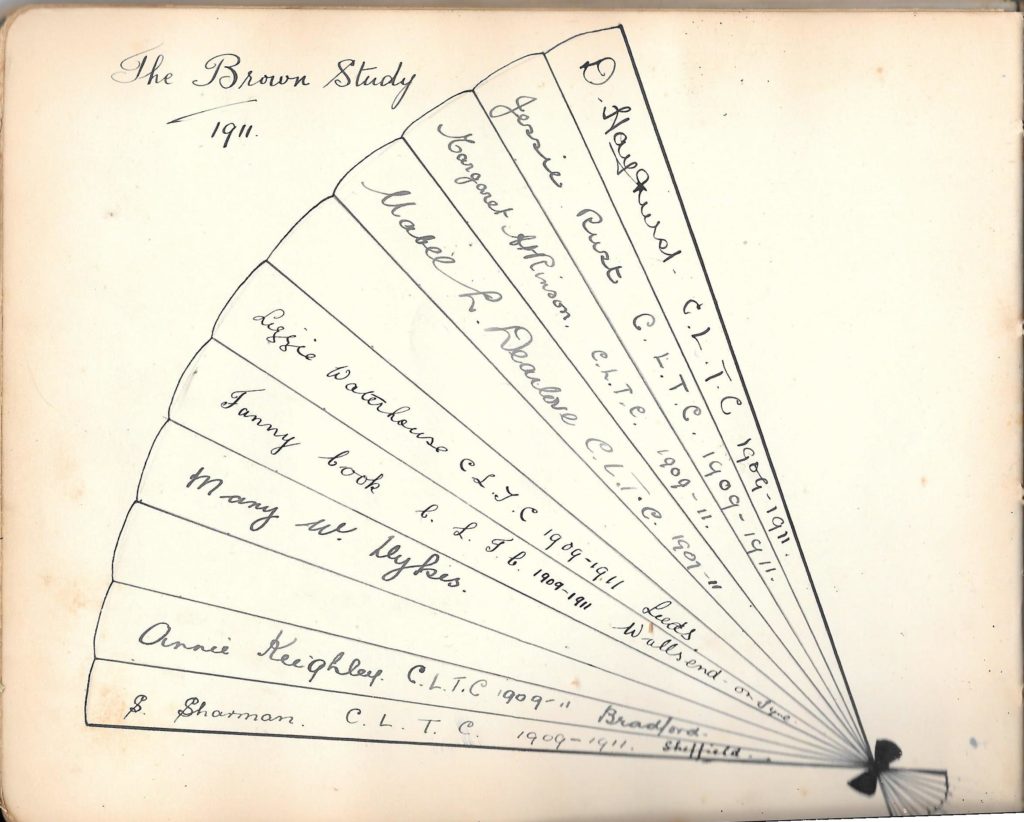 Emily’s album was started on Saturday, 19th September 1908, when she was just seventeen. At the time, she was training to become a teacher at a college in Leeds, part of a close-knit cohort of mostly young women drawn from across England and Scotland. The tradition of keeping a “friendship album” or autograph book was already well established in Victorian and Edwardian society, but Emily’s version is unusually rich both in scope and content. The pages contain not only signatures, but carefully rendered sketches, poetry, witty observations, and sometimes poignant personal reflections.