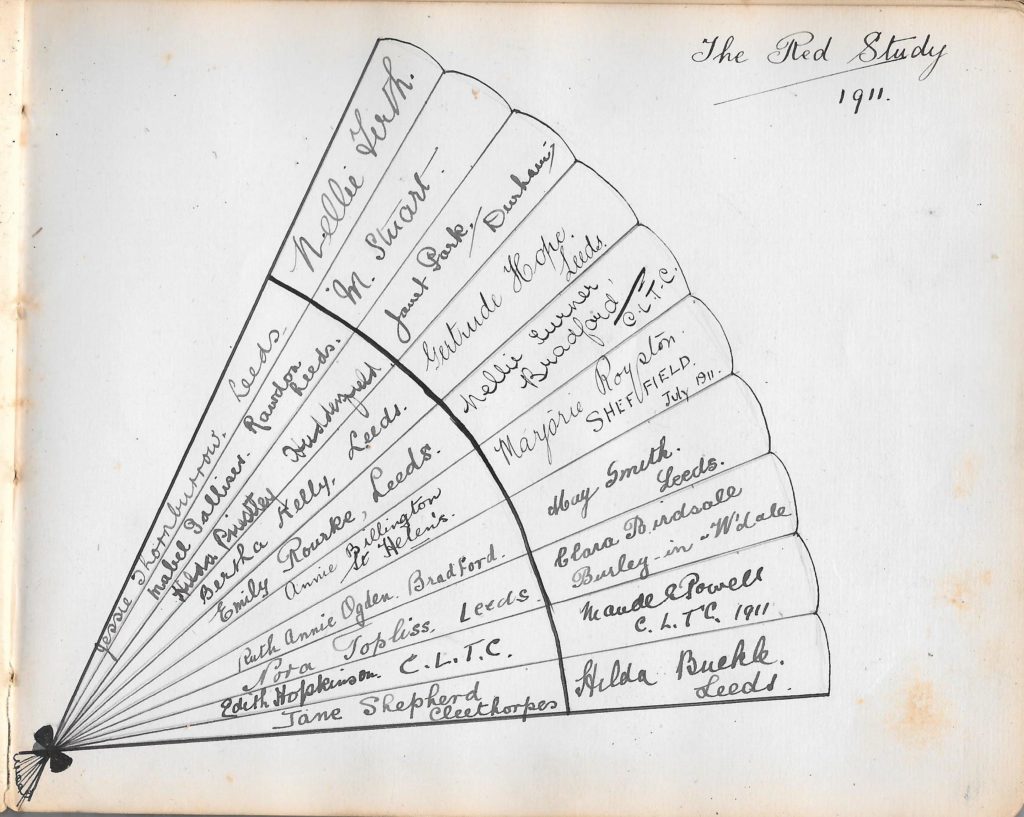 Just left of centre, Lena Shall from Penrith, Cumberland and A. Wilson of Normanton appear, while a little further down, Treda Butterly of Morley and Florence L. Foster from Bradford are present, the latter’s name appearing twice—testament to close friendships or fond memories.