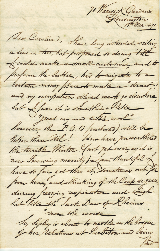 Correspondence from 71 Warwick Gardens, Kensington, to Caroline Noble (nee: Glenister) 15 March 1871 from her widowed father-in-law: