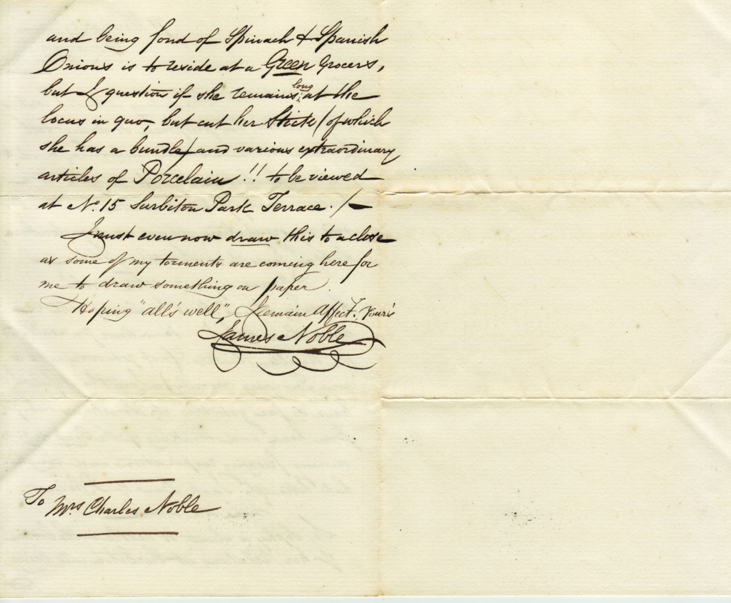James mentions “Sophy” (likely a family member or servant) moving to Surbiton to live with relatives, making a playful comment about her fondness for spinach and Spanish onions and her new residence being a “Green Grocer,” as well as her collection of porcelain. He closes abruptly as he is called away by his professional duties, referring to his colleagues or clients as “tormentors” and signing off with affection.