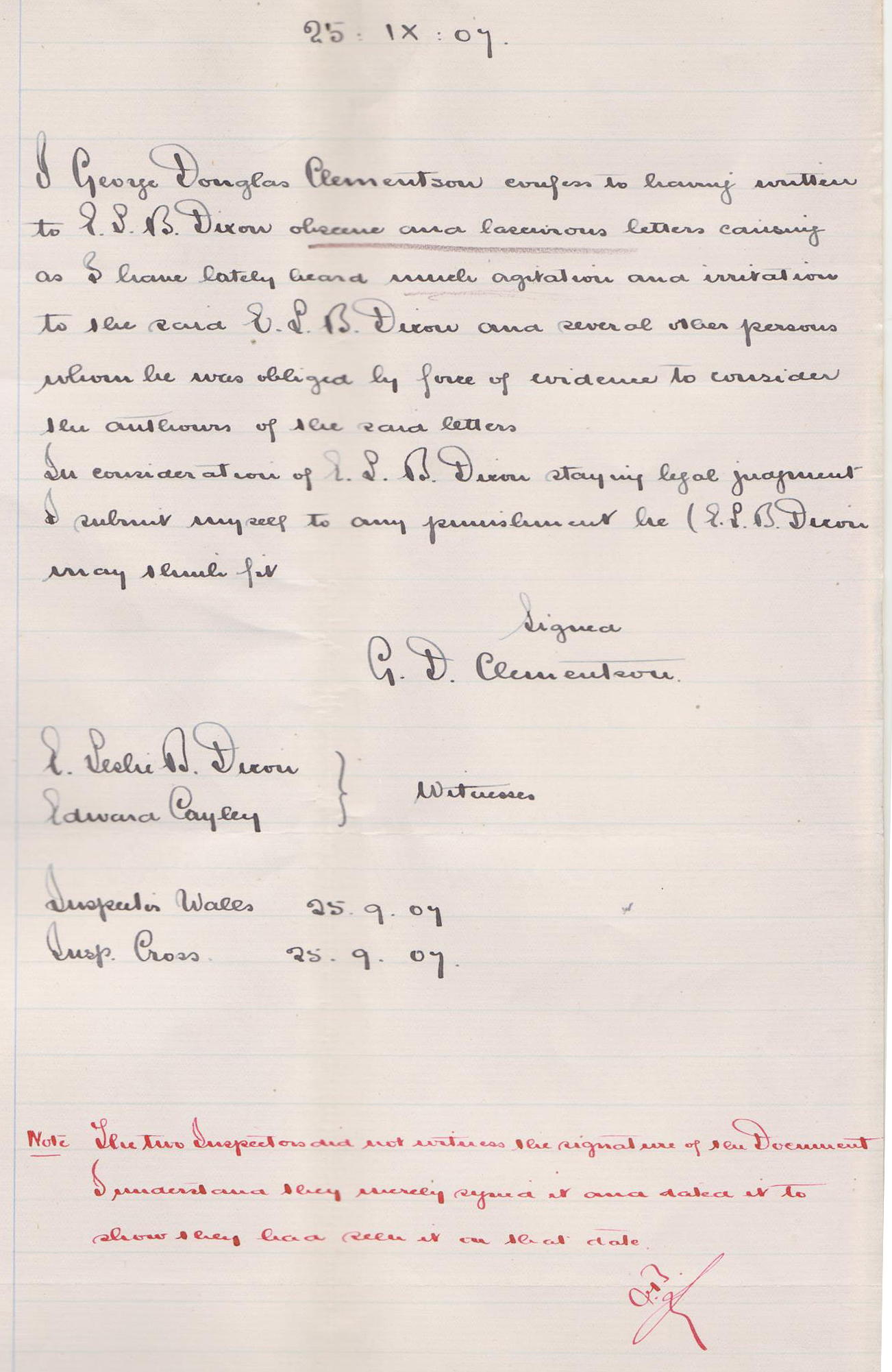 I George Douglas Clementson confess to having wrote on to ELB Dixon obscene and lascivious letters causing as I have lately heard much agitation and irritation to the said ELB Dixon and several other persons whom he was obliged by force of evidence to consider the authors of the said letters.