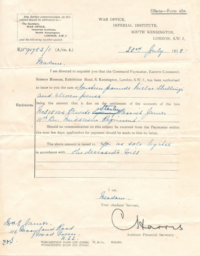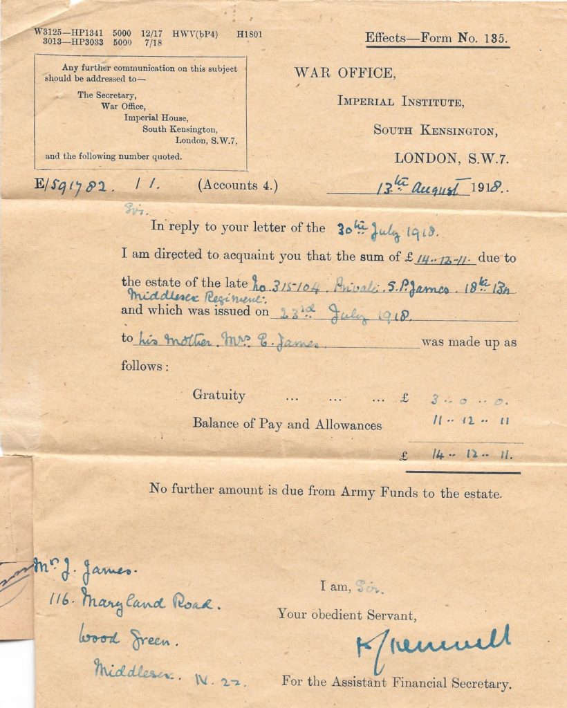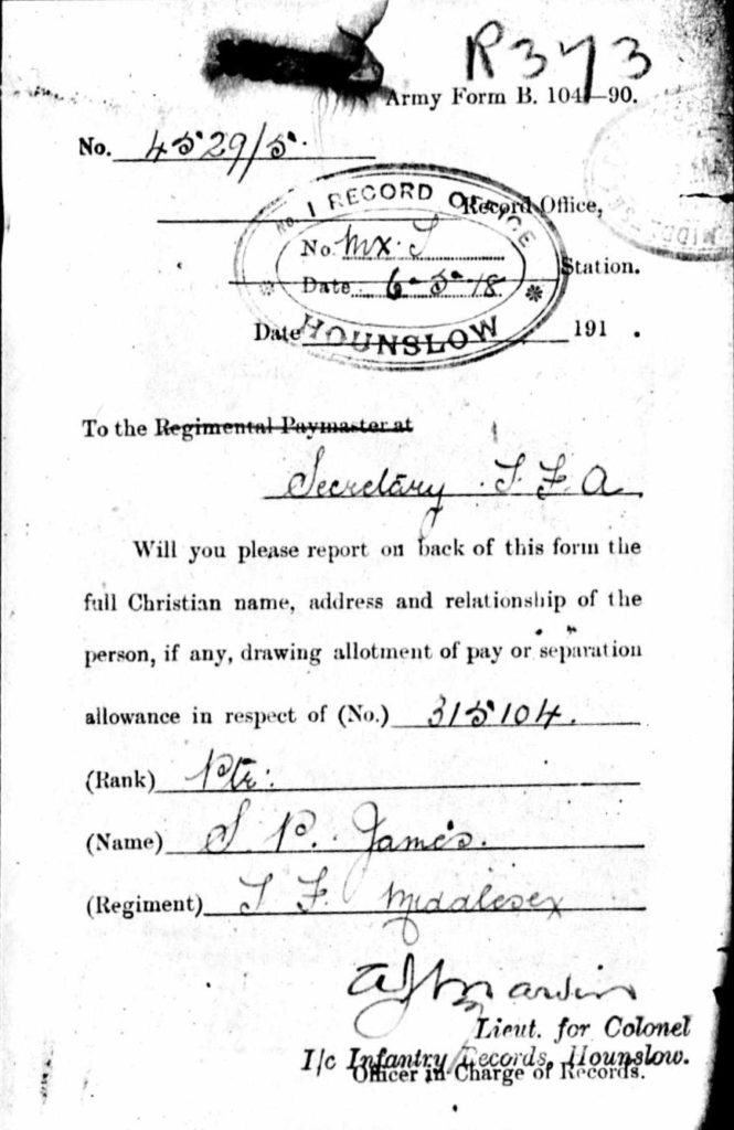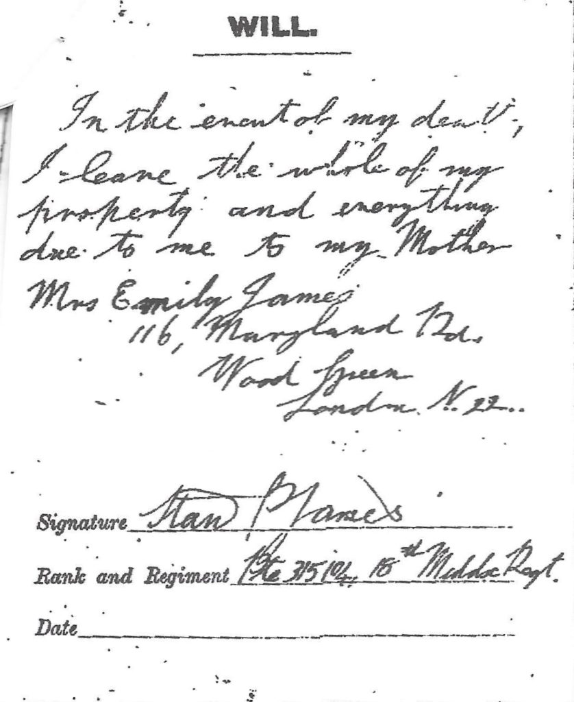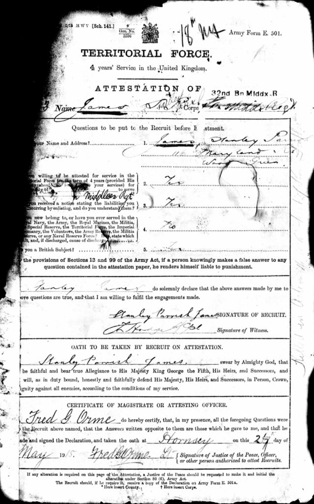 Stanley Parrish James of Wood Green served in the Middlesex Regiment during WW1. He was born in 1897 into a modest, loving family. He was baptised on 26 August 1900 at Camberwell, beginning life in the bustling suburbs of London at the dawn of the twentieth century. By the 1901 Census, Stanley was living in Islington alongside his parents—his mother, Emily (née Say, born 1 August 1866 in Bath), and his father, John James, a railway clerk (born 1 November 1866 in New Southgate). Stanley also had a younger brother, Reginald John James, who was born on 8 June 1902 and would live until 1974.