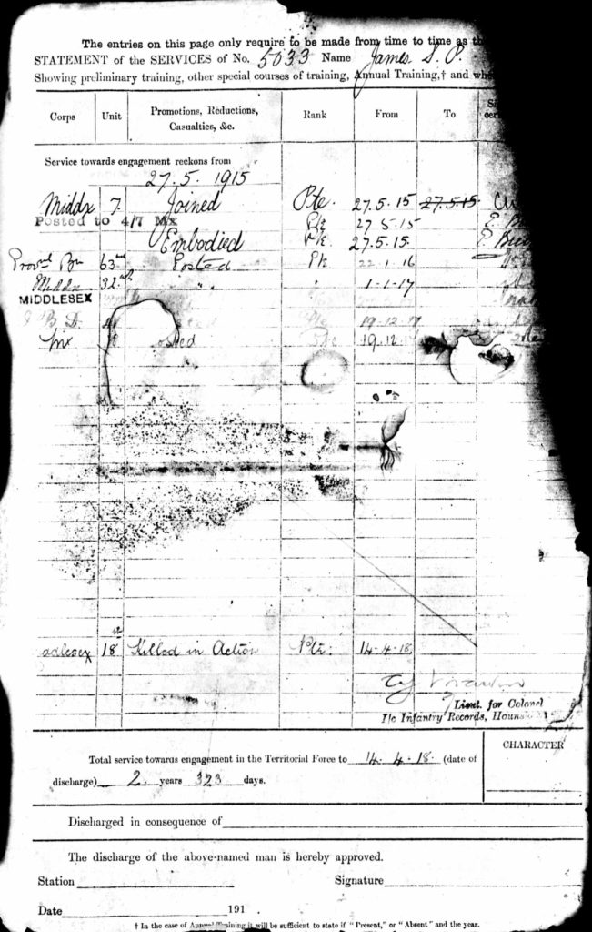 Stanley Parrish James enlisted in the Duke of Cambridge’s Own (Middlesex) Regiment, specifically the 18th (Service) Battalion, one of many “Pals Battalions” raised during the First World War. The Middlesex Regiment recruited heavily from North and West London—ordinary clerks, shop assistants, and apprentices joining up together, often from the same streets or workplaces. This created units bound by strong local ties but also meant that, in times of heavy casualties, entire neighbourhoods could be plunged into grief at once.