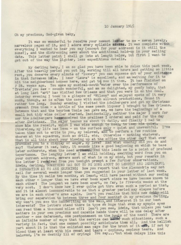 I do hope you will not have a real blue Monday, Sweet. Perhaps this note will bring you a smile and help the day pass quickly. I must stop now as the USO is closing, but I will continue soon because I have so much to tell you. In the meantime, remember always how much I love you and that you are the center of all my thoughts and prayers.