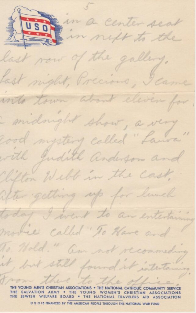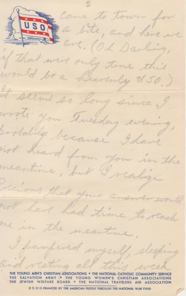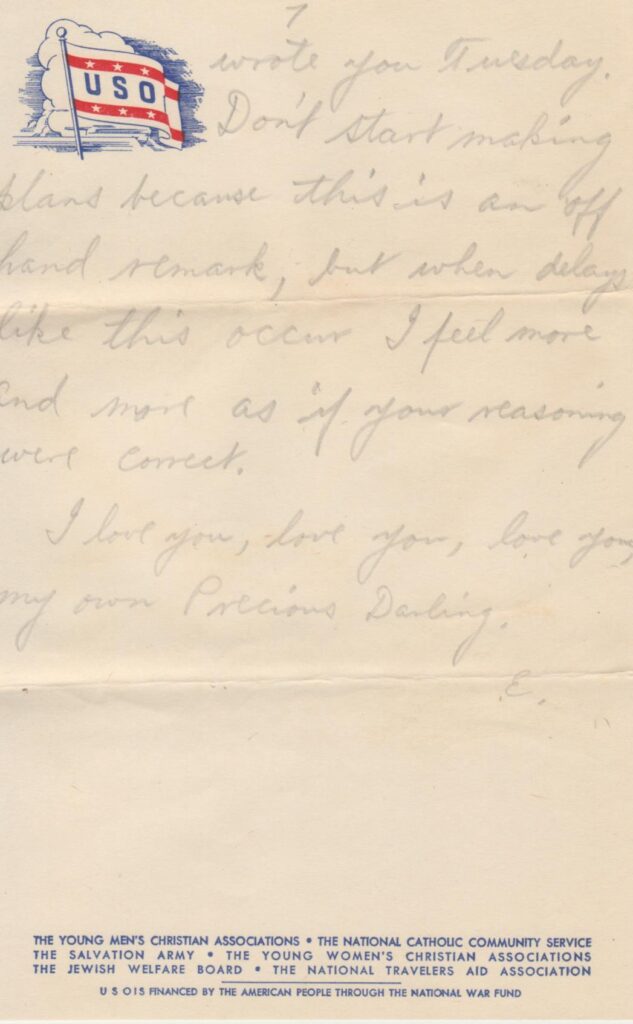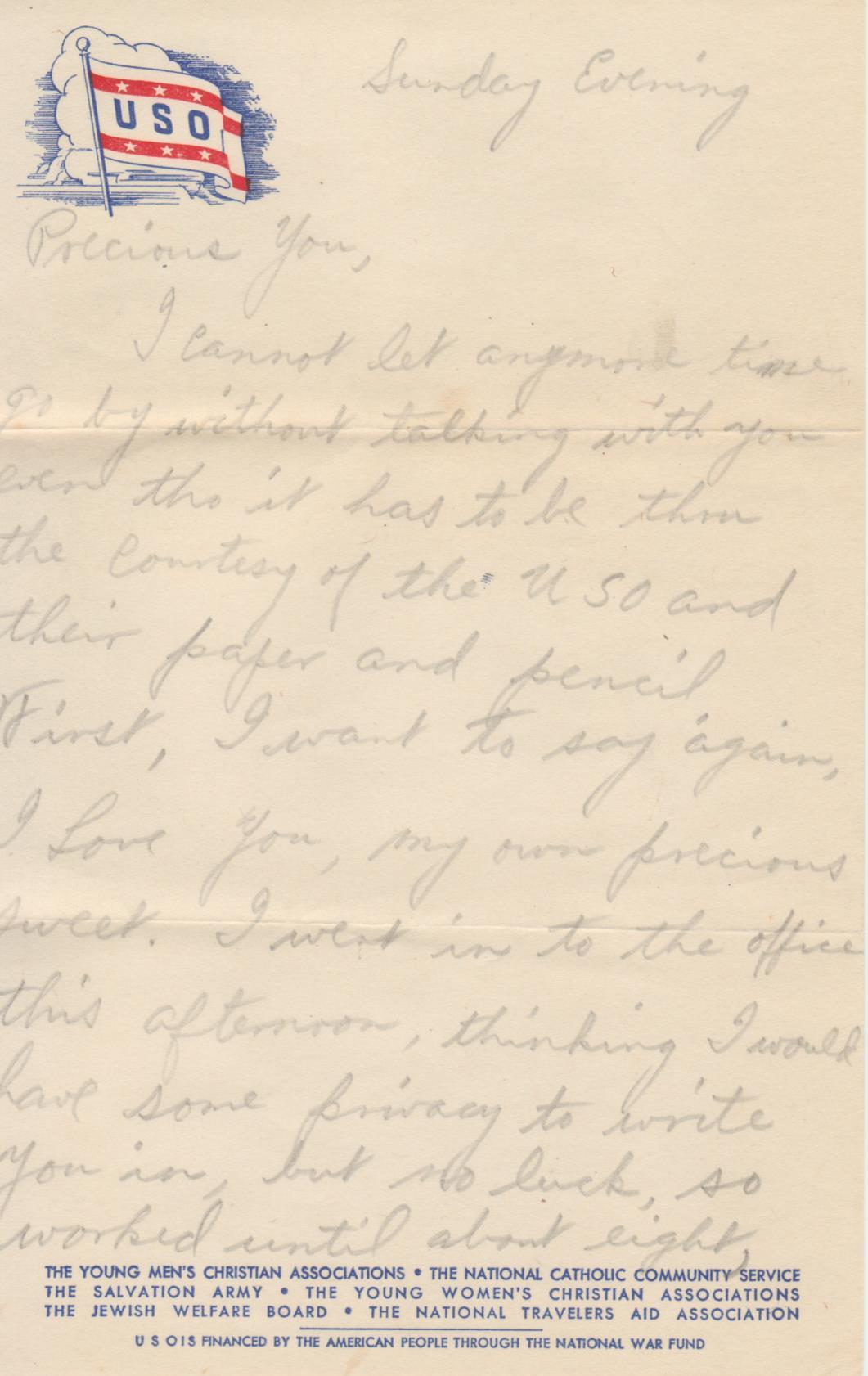I cannot let anymore time go by without talking with you (even though it has to be through the courtesy of the USO and their paper and pencil). First, I want to say again, I love you, my own precious sweet. I went in to the office this afternoon, thinking I would have some privacy to write you in. But no luck, so I worked until about eight, came to town for a bite, and here we are. (Oh Darling, if that were only true this would be a heavenly USO.)