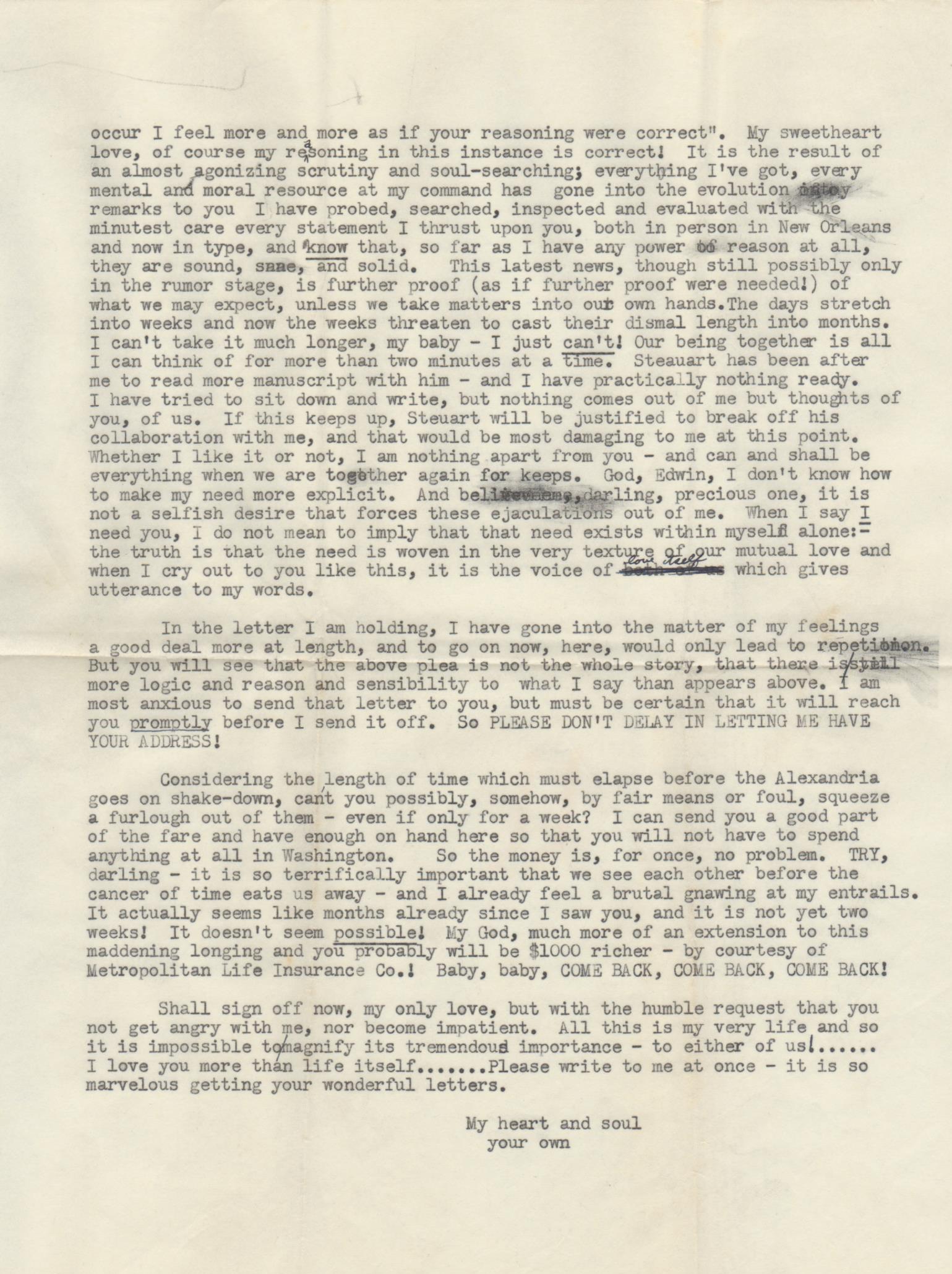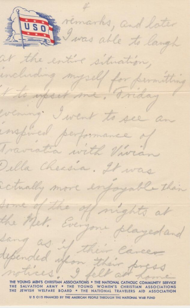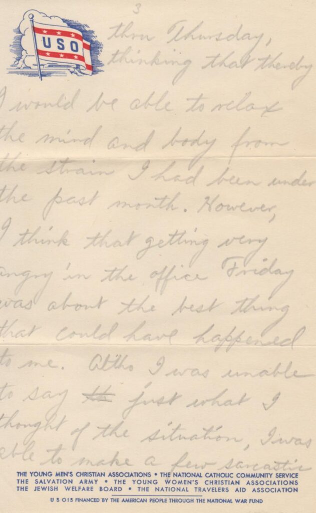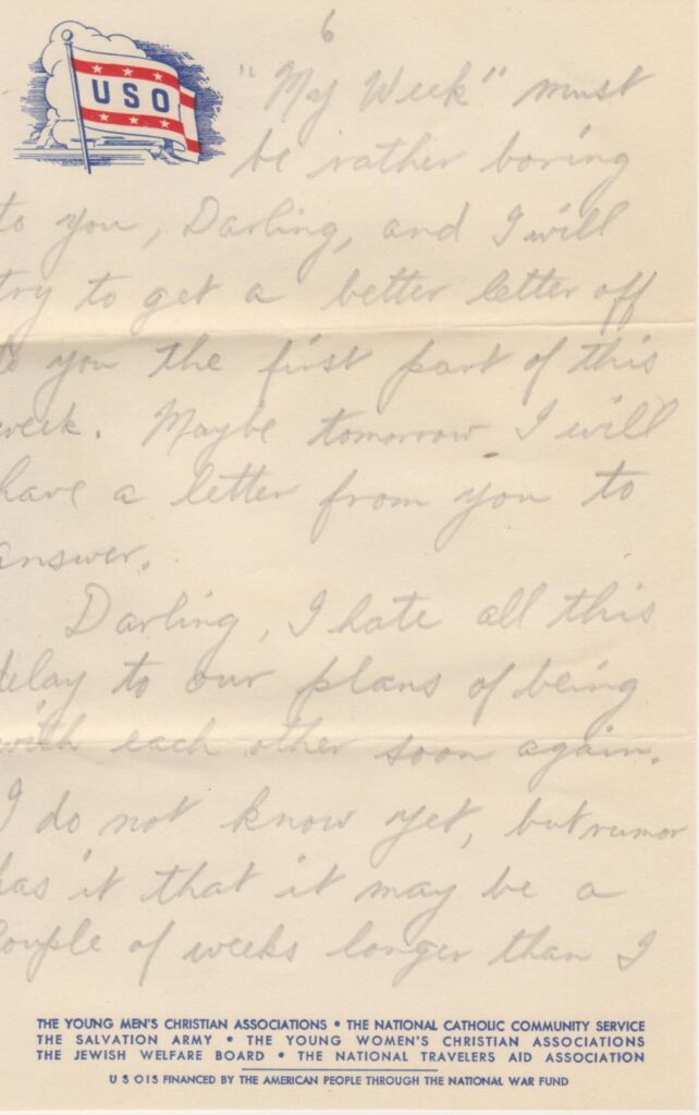I cannot let anymore time go by without talking with you (even though it has to be through the courtesy of the USO and their paper and pencil). First, I want to say again, I love you, my own precious sweet. I went in to the office this afternoon, thinking I would have some privacy to write you in. But no luck, so I worked until about eight, came to town for a bite, and here we are. (Oh Darling, if that were only true this would be a heavenly USO.)