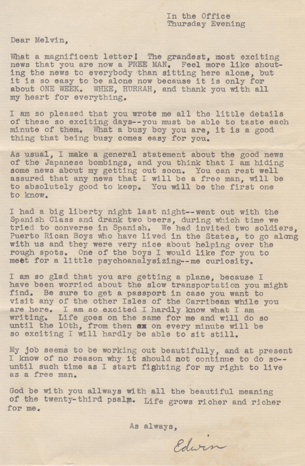 What a magnificent letter! The grandest, most exciting news that you are now a FREE MAN. Feel more like shouting the news to everybody than sitting here alone, but it is so easy to be alone now because it is only for about ONE WEEK. WHEE, HURRAH, and thank you with all my heart for everything.