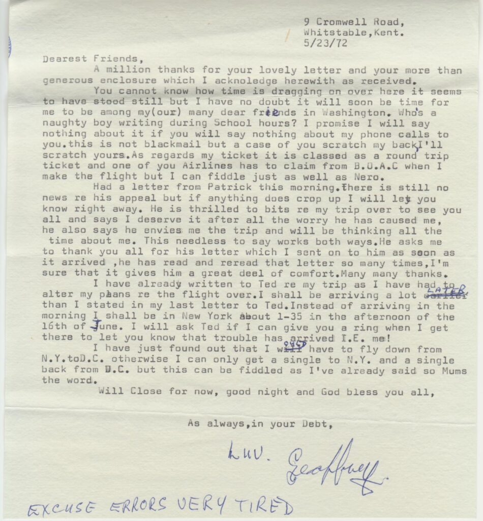Had a letter from Patrick this morning. There is still no news re his appeal but if anything does crop up I will let you know right away. He is thrilled to bits re my trip over to see you all and says I deserve it after all the worry he has caused me, he also says he envies me the trip and will be thinking all the time about me. This needless to say works both ways. He asks me to thank you all for his letter which I sent on to him as soon as it arrived, he has read and reread that letter so many times, I’m sure that it gives him a great deal of comfort. Many many thanks.