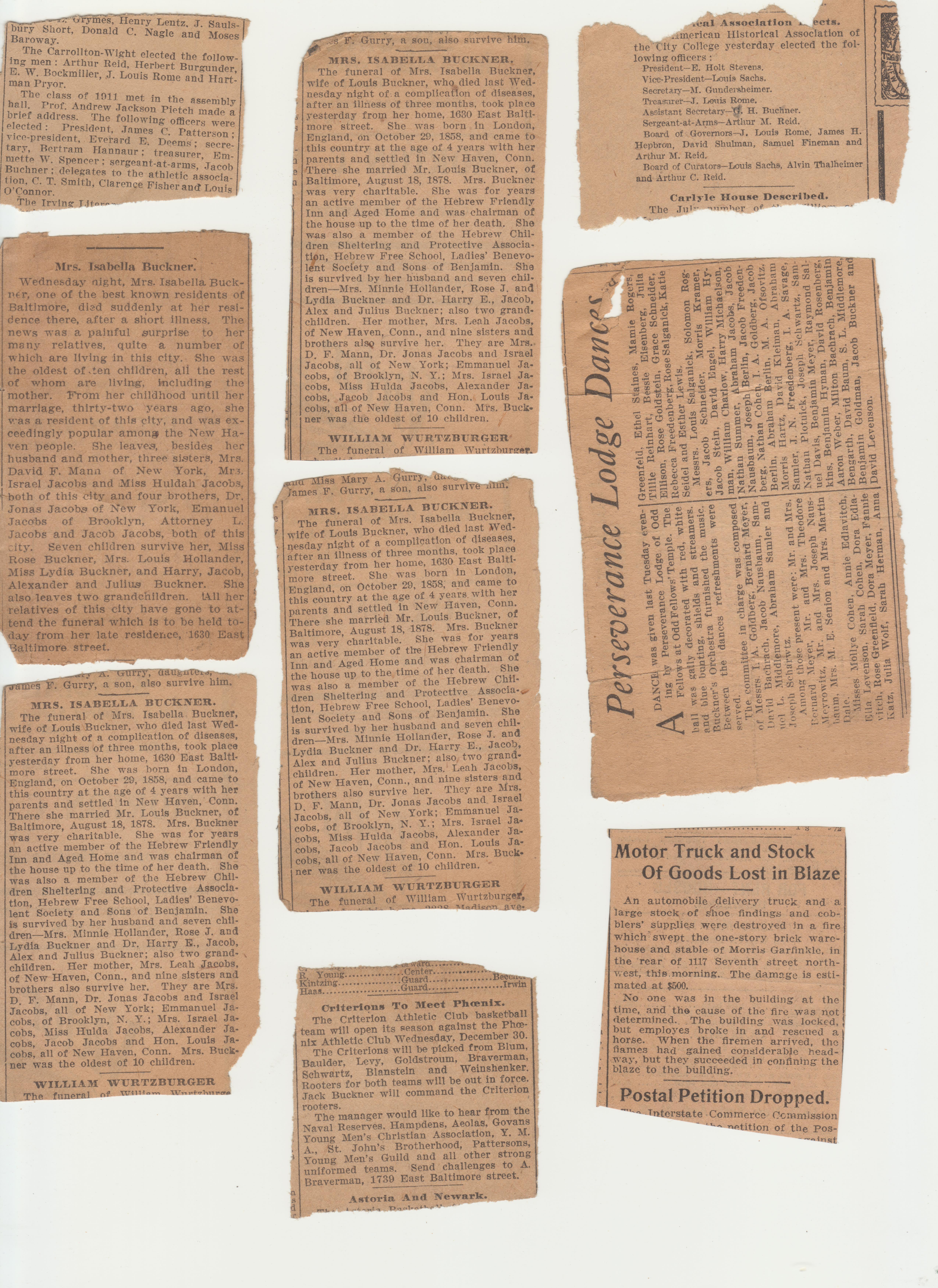 This page contains multiple identical or near-identical obituary notices for Mrs. Isabella Buckner, widow of Louis Buckner, and matriarch of a large and civically engaged Jewish family in Baltimore. The repetition suggests they were placed in different local or Jewish newspapers. There are also several unrelated community snippets and a very short obituary for William Wurtzburger. Most likely these were clipped together because they involve members of the Buckner family or their known social circles.