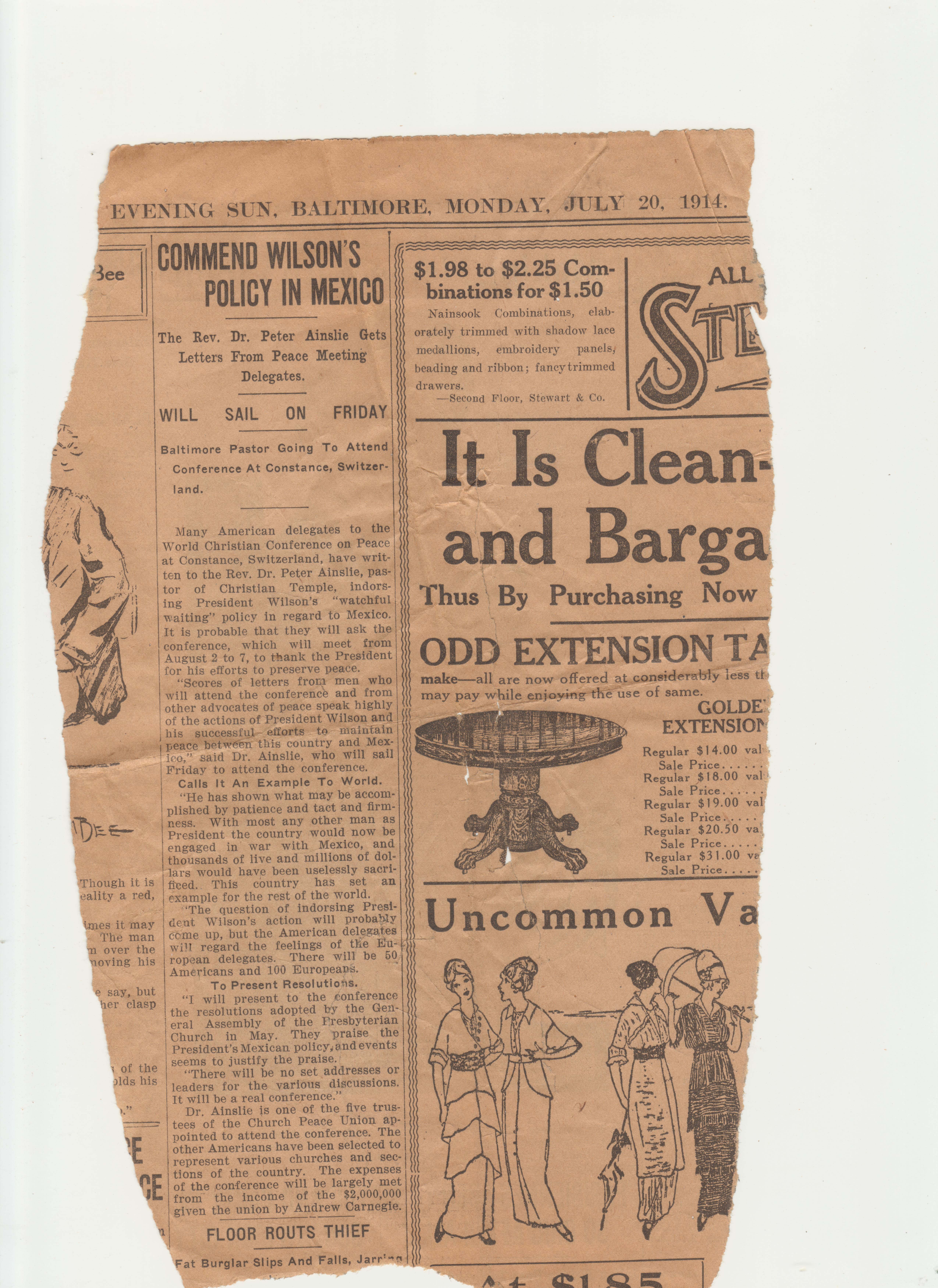 This fragment of the Evening Sun, dated Monday, July 20, 1914, is historically significant because it places the article immediately before the outbreak of World War I (which officially began on July 28, 1914). It focuses on the World Christian Conference on Peace, scheduled to take place in Constance, Switzerland, and the participation of Rev. Dr. Peter Ainslie of Baltimore’s Christian Temple.