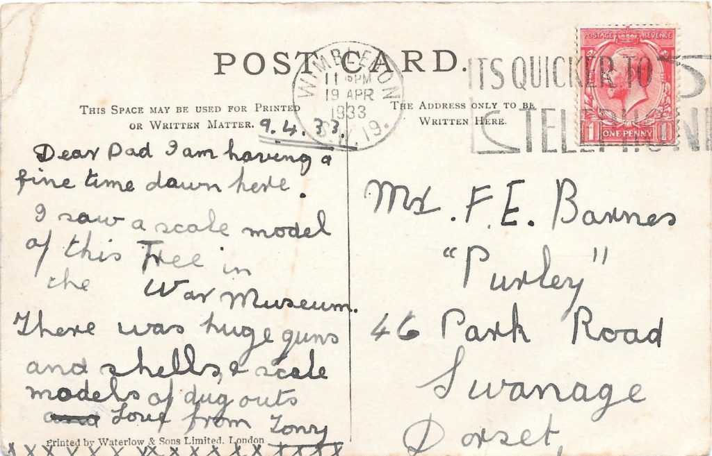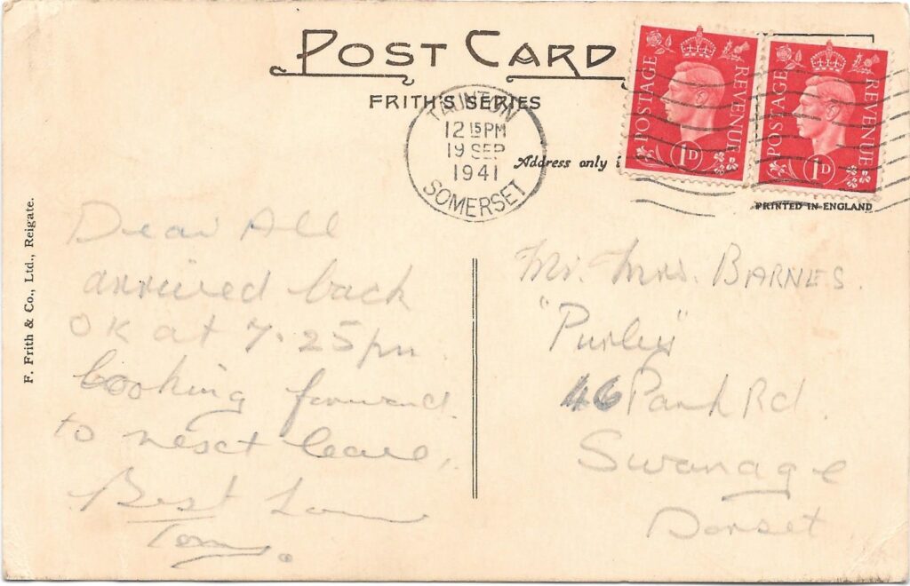 Frank Ewart Barnes, a lifelong Dorset journalist and local news editor, was born on 16 November 1888 in Dorset, his father was John Charles Barnes (born Wimborne, Dorset in about 1849) and his mother, Edna Wallis Barnes (née: Willis born Dorchester 1852 and died 10 May 1937 at Wimborne Minster, Dorset). Frank, a local news editor and reporter (and World War Two ARP warden (more here)), married Mary Jane Snell on 4 November 1915 in Wimborne, Dorset. They had two children (Tony and Marion) (maybe more)). Frank died on the 29 December 1969 in his hometown at the age of 81.