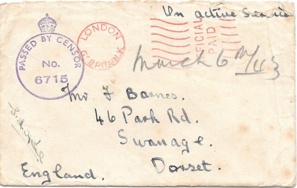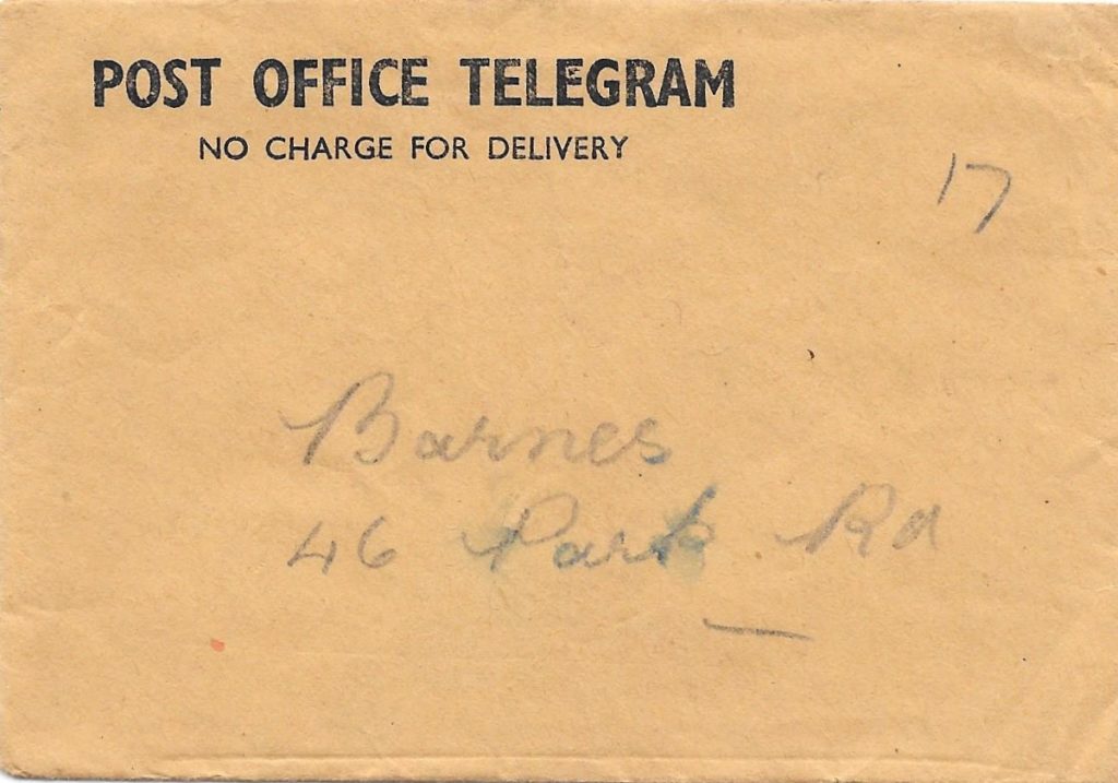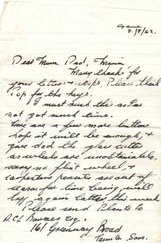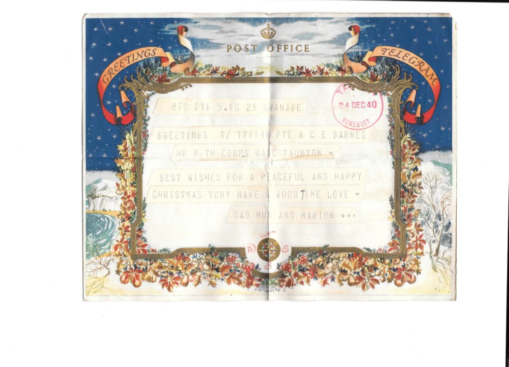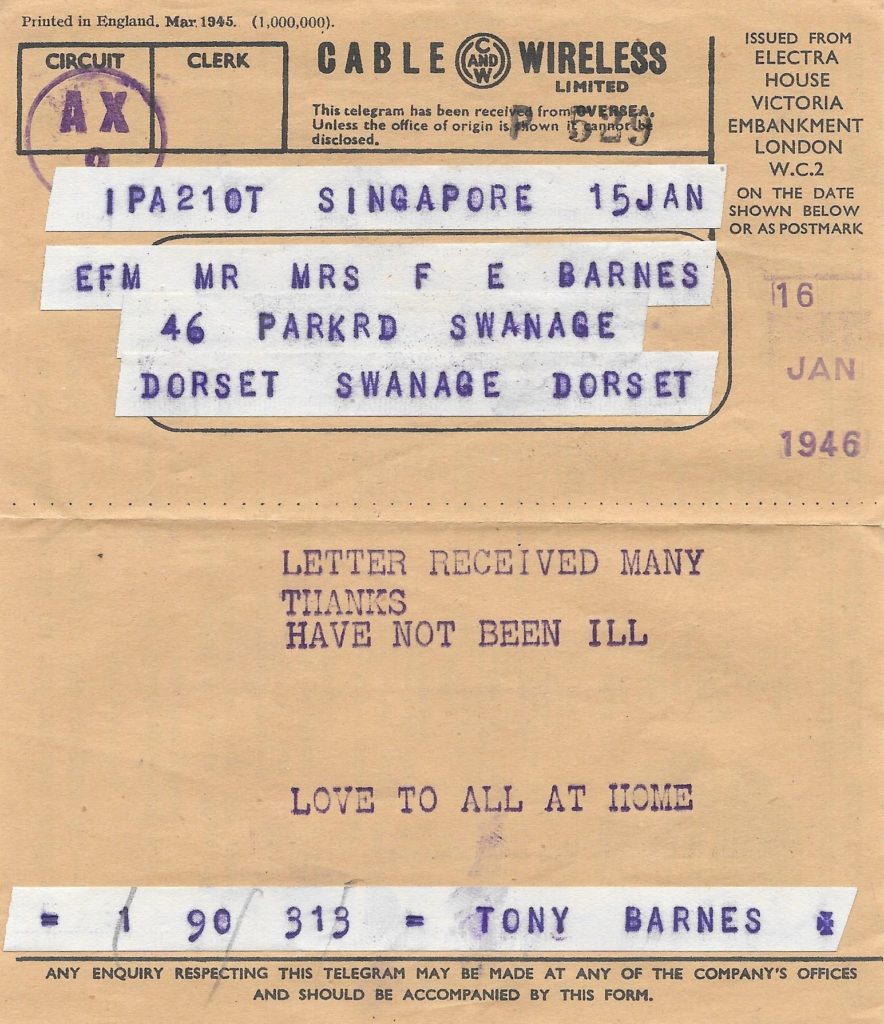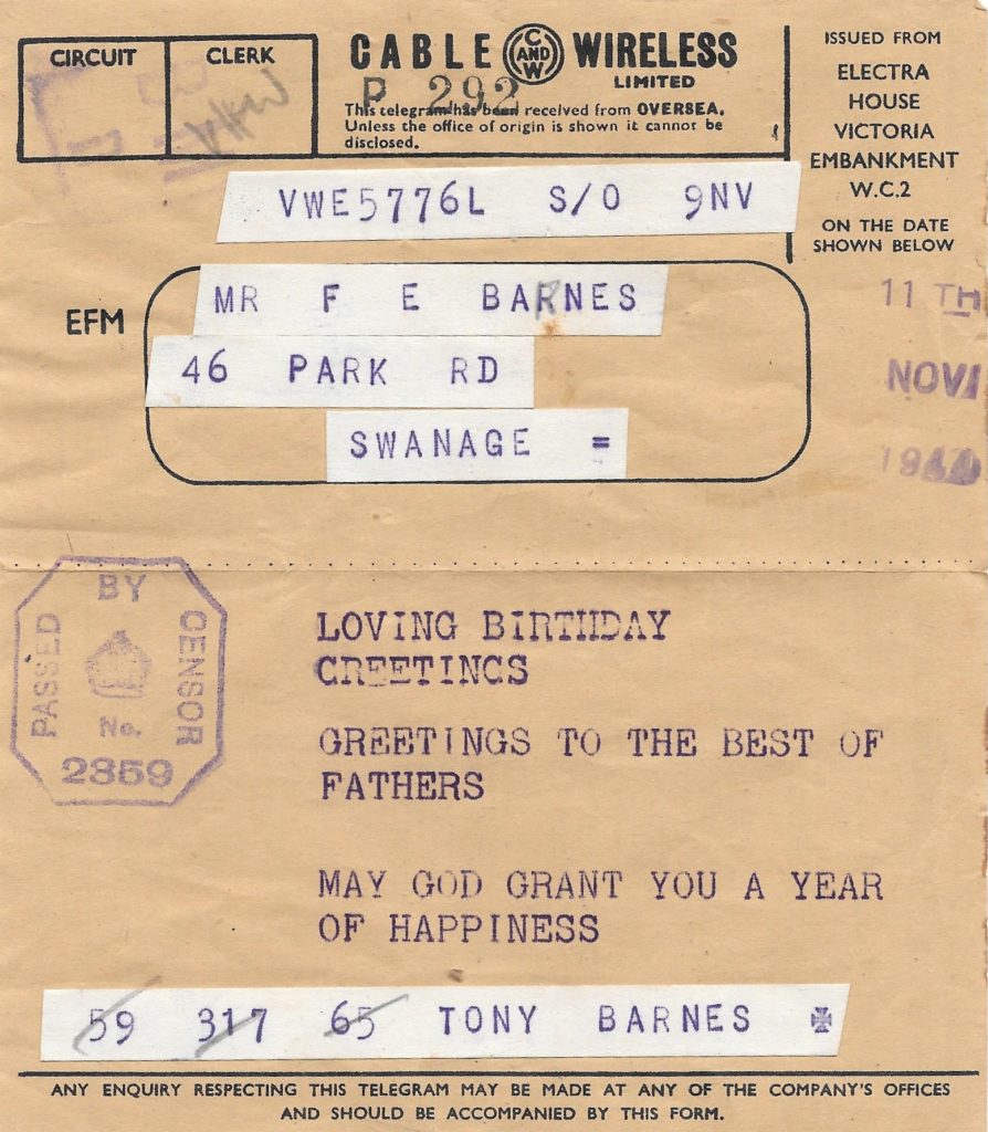 Frank’s son (pictured right), Anthony (Tony) CE Barnes (born in the Wareham, Dorset area 11 June 1920), was an apprentice electricians wireman at the beginning of hostilities in 1939. During the war he served in the British army in the UK and later in Singapore. Much of this archive includes Tony’s correspondence with Frank and his wife during the war years. Tony married his wife, Mary, in 1955 and I believed he died during the mid 2010s.