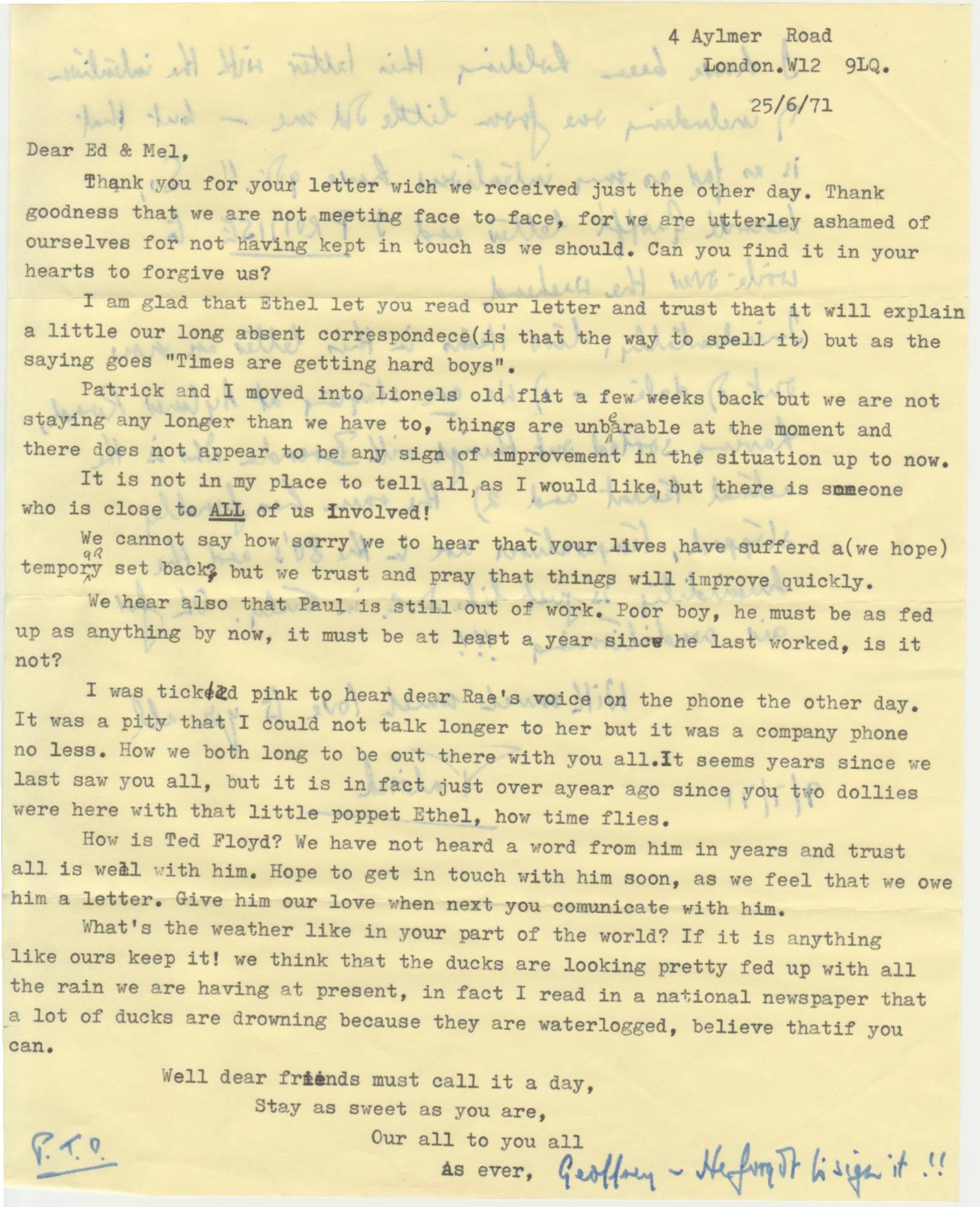 Thank you for your letter which we received just the other day. Thank goodness that we are not meeting face to face, for we are utterley ashamed of ourselves for not having kept in touch as we should. Can you find it in your hearts to forgive us? I am glad that Ethel let you read our letter and trust that it will explain a little our long absent correspondence (is that the way to spell it) but as the saying goes “Times are getting hard boys”.