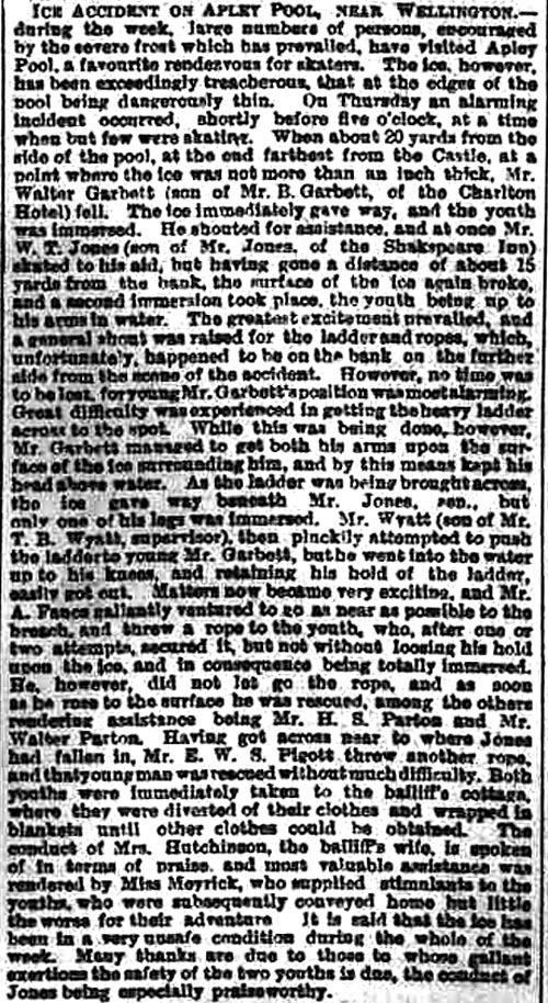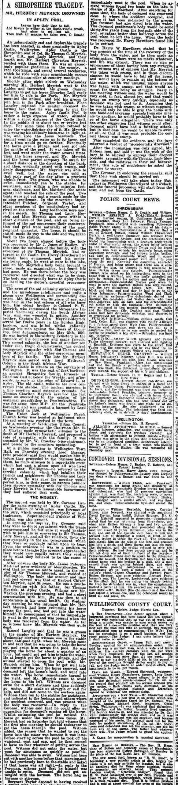 Tragically, bravado on his horse got the better of him – in 1909 he rode his horse bareback into Apley Castle lake where he fell off and drowned. Apley Castle was built in 1792, it no longer exists and was demolished in 1955.