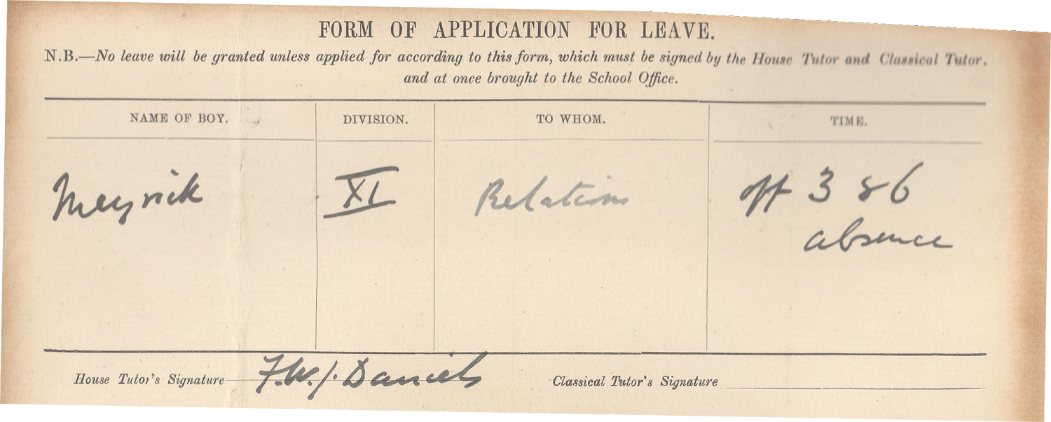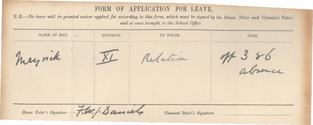 In August 2017 I acquired a large photograph album and scrapbook from an online auction website after being found at a ‘local flea fair’. Originally it was was the property of Herbert Chiverton Meyrick of Apley Castle, Shropshire. He compiled it during his time as a pupil at Eton College and afterwards. It contains his photographs, drawings and cuttings as well as his Eton College leave notices, his punishment references, detention slips and other ephemera that he felt was significant enough to him for it to be kept.