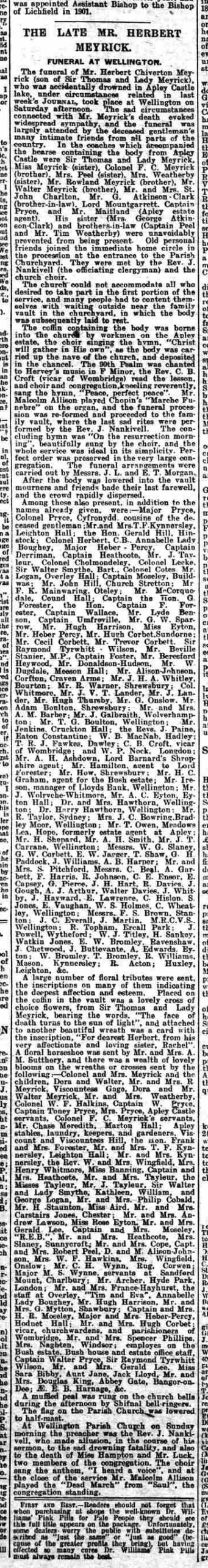 Herbert went to Eton (1888-1891) and fought in the Boer War serving in The Rhodesian Field Force (1900-1901). He was drowned at his home, Apley Castle, on the 19th May 1909.