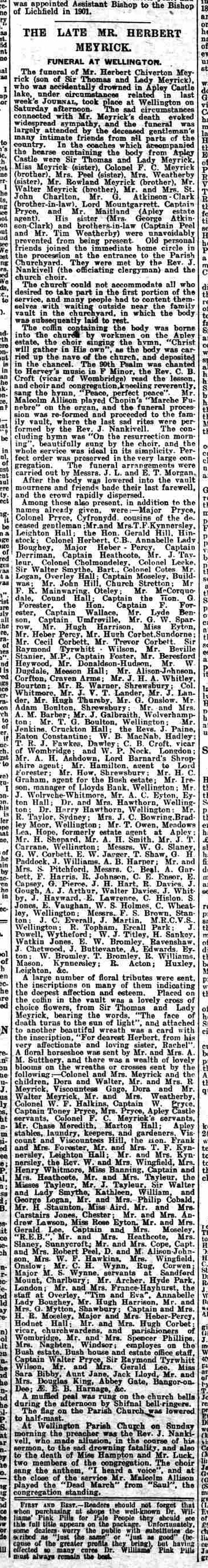 The news of the sad calamity spread rapidly, and the unwelcome intelligence oast quite a gloom over Wellington and surrounding districts Mr. Meyrick was 34 years of age, and was held in the best esteem of all who knew him. His eldest brother is Colonel F. W. Meyrick, who commanded the Shropshire Imperial Yeomanry during South African War, and was wounded in action. Another brother, Captain St. John Meyrick-Meyrick, served for twelve years in the Gordon Highlanders, and was killed whilst gallantly leading his men against the Boers at Doornkop, near Johannesburg on May 29th, 1900. He was buried in Maraisburg Cemetery in the presence of his comrades and many friends. This second calamity, the loss of another son under such tragic circumstances, has evoked widespread sympathy with Sir Thomas and Lady Meyrick and the other sorrowing members of the family. The late Mr. Herbert Meyrick also served with Lord Methuen’s Column in the South African War.