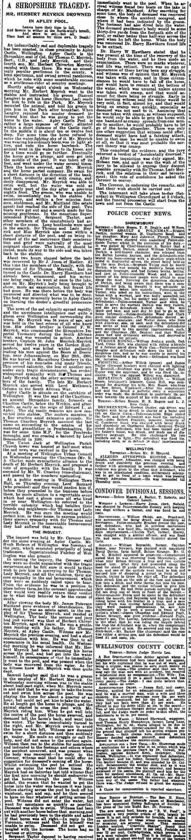 After viewing the body Mr. James Paterson Maitland gave evidence of identification. He said that he was an estate agent, in the employ of Sir Thomas Meyrick, and resided at Wellington. The body the coroner and jury had just for you to what was that of Herbert Chiverton Meyrick, aged 34 years. He was a gentleman residing with his father, Sir Thomas Meyrick, at Apley Castle. Witness saw Mr. Meyrick the previous evening, and had a short conversation with him. He was then to all appearance in his usual health. On Wednesday morning he was informed that Mr. Herbert Meyrick had been swimming his horse across the pool, and had got into the water himself. In consequence of that he immediately went to the pool, and was present when the body was recovered from the water. As far as witness knew Mr. Meyrick was then quite dead.