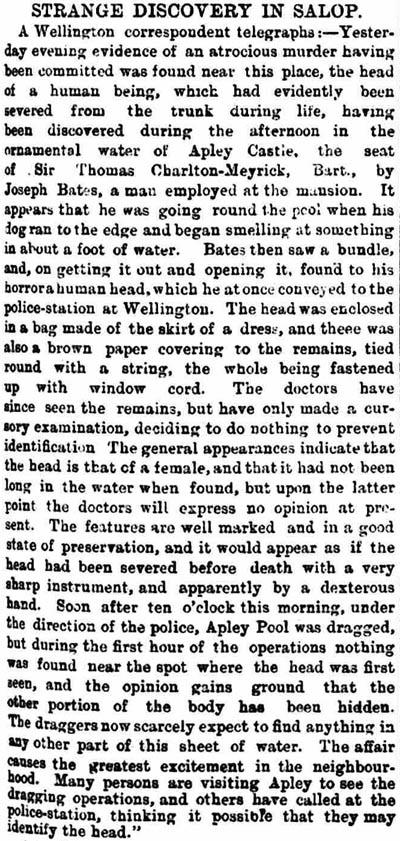 “The Wellington correspondent telegraphs: Yesterday evening evidence of an atrocious murder having been committed was found near this place, the head of a human being, which had evidently been severed from the trunk during life, having been discovered in the afternoon in the ornamental water at Apley Castle, the seat of Sir Thomas Charlton-Meyrick, Bart., by Joseph Bates, a man employed at the mansion. It appears that he was going round the pool when his dog ran to the edge and began smelling at to something in about a foot of water. Bates then saw a bundle, and, on getting it out and opening it, founded to his horror a human head, which he at once conveyed to the police station at Wellington.