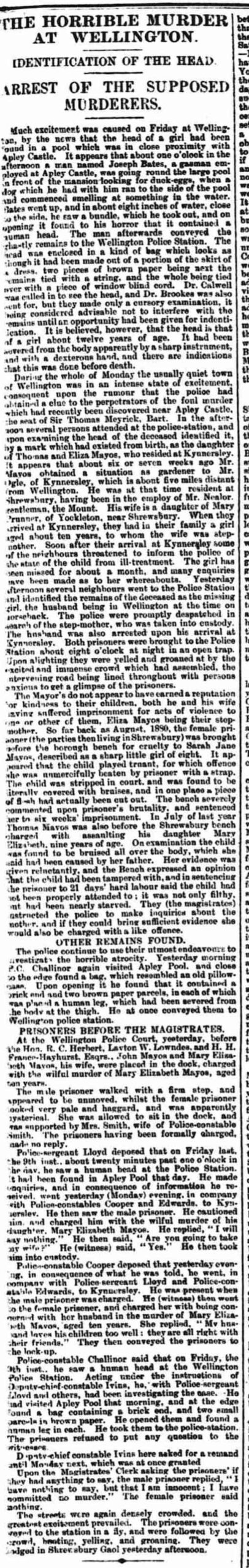 The police, under the direction of Mr. Superintendent Ivin, Deputy-Chief-Constable of the county, and once proceeded to investigate the case their first visit being paid to the place where the head was found. Nothing noteworthy was done that evening, but only on Saturday morning dragging operations were commenced, to ascertain if any other portions of the remains have been consigned to the same watery grave. No result, however, was obtained, and it was decided, by the permission of Sir Thomas Meyrick, Bart., to run off the water from the pool. On Sunday a bag containing a large Ketley cluder was found, a number of excited spectators being present at the time, and the prevalent idea was that the head had been originally enclosed in his bag, and that it had been washed out by the action of water. The police cautioned their search in the pool and also in the adjoining plantation with renewed energy. On Monday, about 1.00, just a the close of magisterial business of the Petty Sessions, the rumour unlike a wildfire through the town that the police had obtained a clue to the mystery, and that, in fact, the head had been identified. Numbers soon congregated around the Police Station eager to ascertain whether the rumour had any foundation. In this they were not disappointed. A woman named Isabella Hicks, of Kynnersley, who suspicions had been aroused by the descriptions which had appeared in the newspapers, presented herself at the Police Office and asked them to be allowed to see the head which had been found. This request was immediately complied with by police constable Smith. As soon as Mrs. Hicks had seen and examined the head she identified that of a child named Mary Elizabeth Mayoe, the daughter of Thomas Mayoe, who had previously come to Kynnersley, and who was in the employ of Dr. Ogle as groom and gardener. She had no doubt about it –she was quite confident that the head was that of the child she had mentioned. Mrs. Hicks then made the following statement: “I am the wife of William Hicks, cowman for Mr Ogle, of Manor Farm, Kynnersley. Nine weeks and last Thursday Thomas Mayoe and his wife and four children came to live at Kynnersley. The children were aged respectively seven, 10, 12, and 14. Mayoe came to work as groom for Mr. Ogle. He came from Shrewsbury. He and his wife lived next door but two to me. I believe the children are not at all Mrs. Mayoe’s children, but some of them are her husband’s by a former marriage. The child of 10 was a girl I have seen her only three times since they came I have not seen her for six weeks, but some other neighbours saw her on the 11th of January, about ¼ mile from her home. Thomas Mayoe came to Kynnersley on “Gawby Market” Day, December 28. The Sunday after they came the child was heard screaming in the house, and my husband went to Mayoe’s and his wife about it, they abused him. Last Friday week Mrs. Mayoe told Mary Evans, a neighbour, that she was going to take the girl to an institution and Shrewsbury. The next morning Mayoe and his wife was seen before 6.00 AM by George Walford, waggenor to Mr. Ogle, going in the direction of Preston, but no girl was seen with him. The girl at this time had not been seen for six weeks. The girl appeared not to have been well cared for. She was a thin, poor little thing, and did not seem to have enough to eat. Mrs. Mayoe told one other neighbours, Mrs. Turner, than she had been obliged to cut the hair from the back of the girl’s head because it was sore, and that she had got some ointment have stopped has have. The nose was flat; he is were very small. I have seen the head which was found in Apley Pool. I saw in the Wellington Journal that the head had been found. From the description they’re given I became suspicious, and I went to the Police Station at Wellington. As soon as I saw it I said he was the head of Mary Mayoe. I believe that is her name, but her parents called her ‘Polly’. The appearance of the nose and the ears led me to believe that it was this child’s head. On Saturday Mary Evans asked Mrs. Mayoe if she had seen account in the Journal of the head had been found in Apley Pool. Mrs. Mayoe said she had not, that she had not had time, having been busy cleaning. I saw Mary Evans talking to her. Since this has come out, Mrs. Mayoe has looked quite bewildered. I have not spoken to her since last Friday. On the 11th of January, Mrs. Hughes, another neighbour, wrote a letter to send to Superintendent Ivins, complaining that the child had been ill-treated. The child had run away from home and gone to Mrs. Hughes house, and told her that her mother had beaten her, and there was a wound on one of the girls arms. The latter was not send, as Mrs. Mayoe took the child home. One of Mrs. Mayoe’s boys told one of my children that his mother took Polly away last Saturday week, and that she was not coming back yet.” You paragraph as may be imagined, this positive identification, which was subsequently confirmed by other persons, neighbours of the Mayoe’s family, Kerr at the utmost sensation and the people became almost frantic with excitement. At this point the most remarkable incident occurred. A man on horseback rode up, and on passing through the crowd made inquiries as to what was the matter. He was informed that the head had been identified as that of a child from Kynnersley. The man was no other than Mayoe. Our how are you immediately rode off in the direction of Kynnersley, those in his horse to it’s the utmost speed. The police aware of course directly on the alert. Sergeant Lloyd, police constable Cooper, and police Constable Edwards went with all haste to Kynnersley, and found both the man and his wife at home. Sergeant Lloyd charged Mayoe with the wilful murder of his child Mary Elizabeth, and his reply was, “I shall say nothing.” He then inquired if they were going to take his wife too, and was answered in the affirmative. In the meantime police constable Cooper had