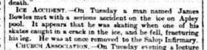 “On Tuesday a man called James Bowles met with a serious accident on the ice on the Apley pool. It appears he was skating when one of his skates caught in a crack in the ice, and he fell, fracturing his leg. He was at once removed to the Salop Infirmary”.